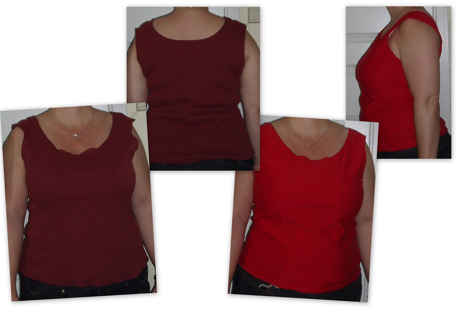 Dette ble en test i dobbel forstand. Først fordi jeg, enkelt og greit, tegnet mønster etter en kjøpt sommertopp som jeg bruker my. Deretter fordi jeg har liten erfaring i å sy i slike elastiske topper.Symaskinen min er en Janome Jubilee 85, den har noen elastiske sømmer og jeg har så langt brukt den elastiske rettsømmen samt trestings-sikksakk. Studerer du bildet nøye ser du at dette ikke er godt nok. Det mørkeste stoffet er veldig elastisk, der la jeg et annet stoff under før jeg sydde, kun for å stabilisere. Men det ble ikke godt nok, jeg får forsøke å "jukse" dette til for kanten ble litt for løs. Den røde toppen ble noe bedre i og med at det stoffet er litt mindre elastisk.