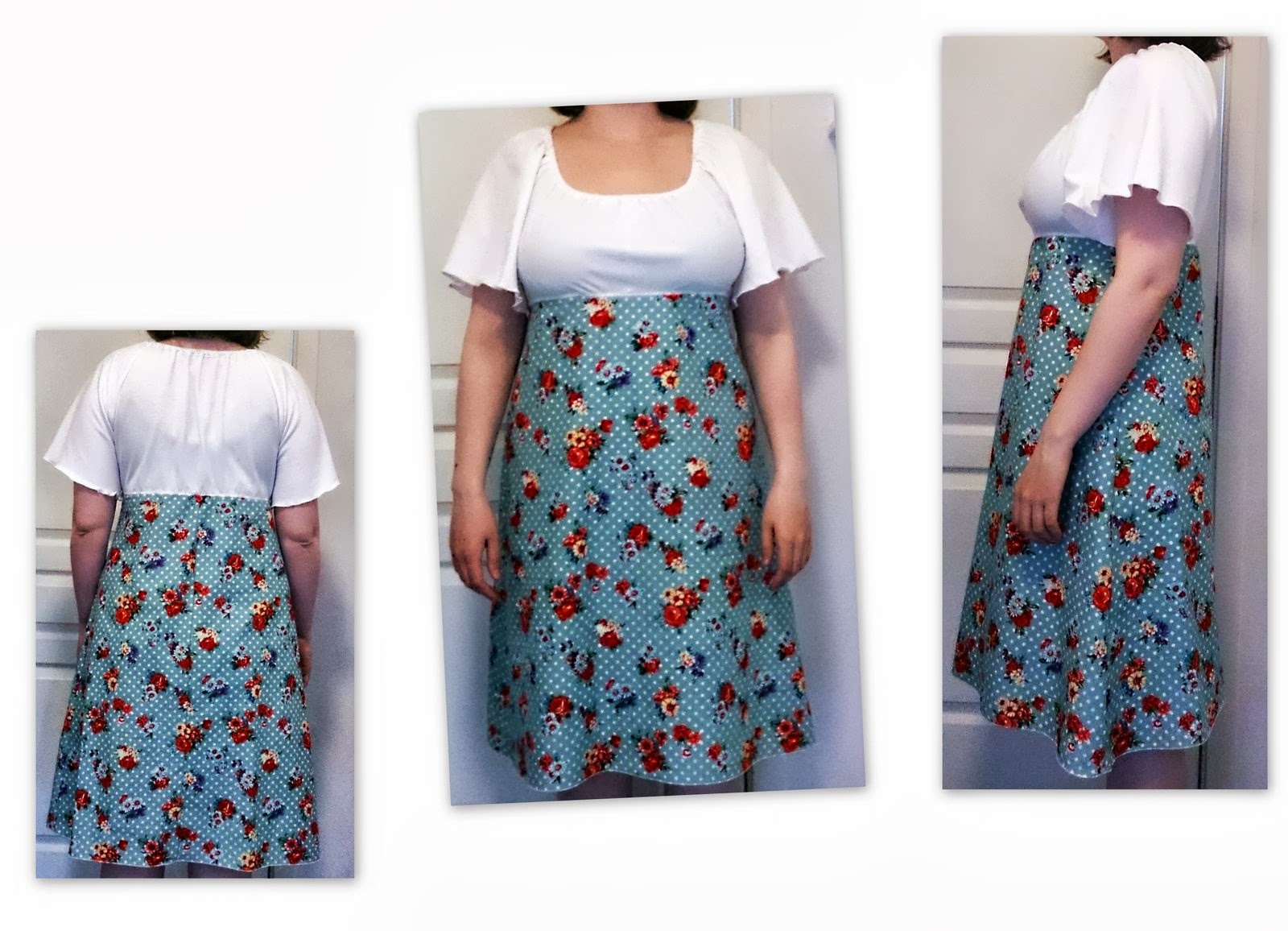 Stoff kjøpt i Rotterdam og fra restekurven hos Stoff og stil (det hvite). Begge er en form for jersey. Det hvite er veldig gjennomsiktig, forstykke og rygg er dermed sydd i dobbelt stoff. Mønster hentet i boken Made by me, mønster Sukkertøykjole.