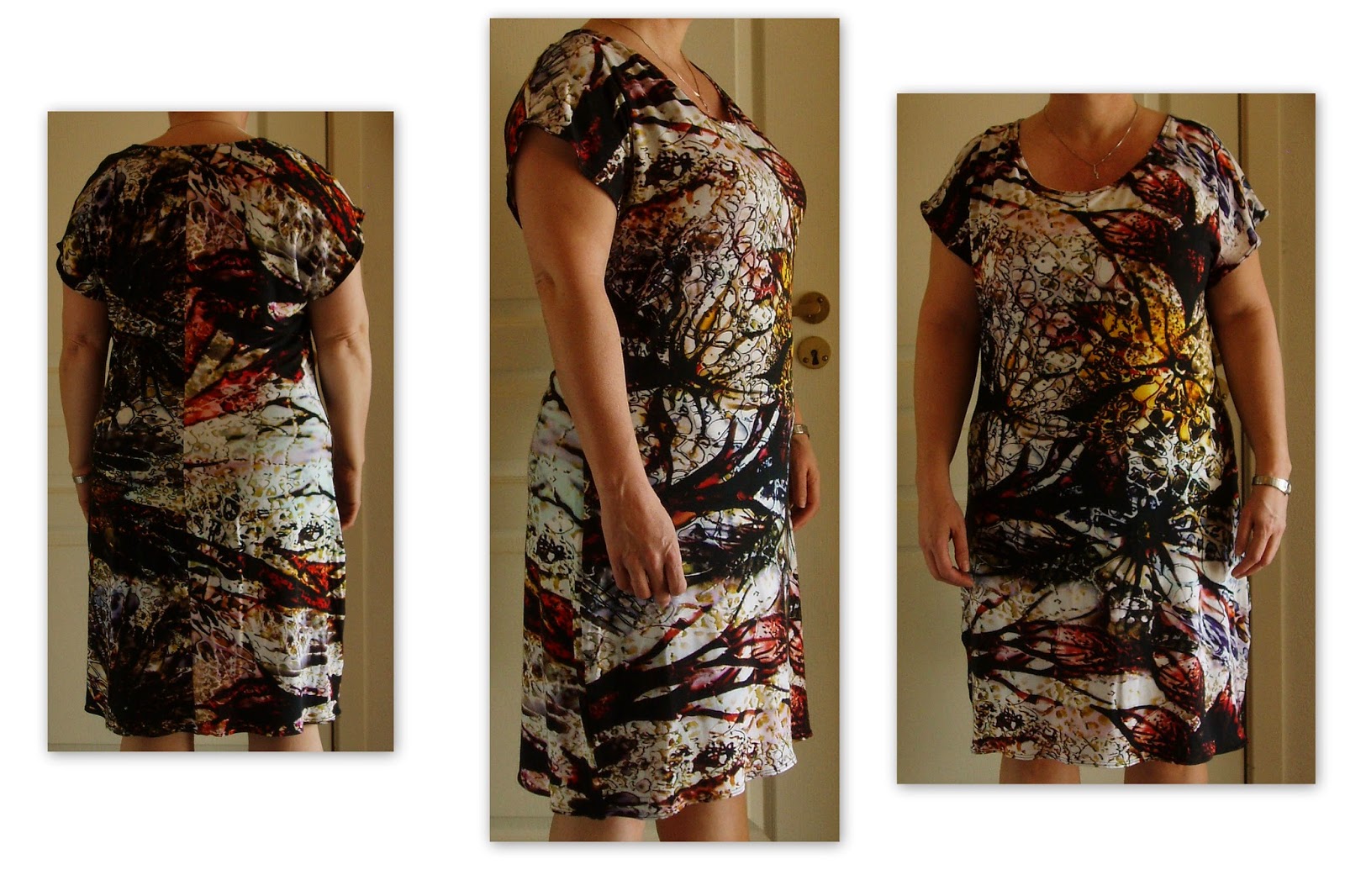 Kjørepose av restestoff, kjole av rester etter dukkemorens kjole og lue strikket i alpakke. Søm-mønster hentet fra Anne Grethe Gaaseruds bøker, mens strikkemønsteret er hentet fra Målfrid Gausels bok.